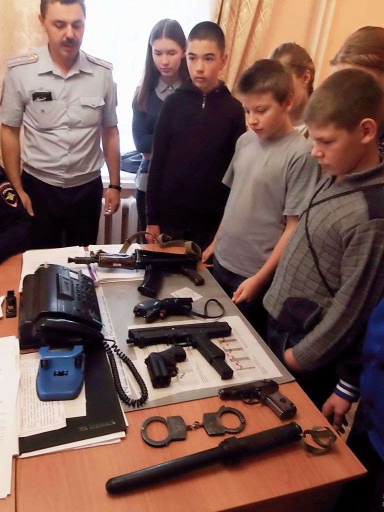 31 октября ребят ждала интересная экскурсия в отделение полиции, в музее внутренних дел. Экскурсию для учащихся провела старший лейтенант внутренней службы Салькова О., помощник начальника отделения (по работе с личным составом). Затем ребят познакомили со специальными средствами, состоящими на вооружении полиции (автомат, пистолет, электрошокер, боевой шлем, противогаз, бронежилет …). Майор полиции Филипчук В., начальник отделения участковых уполномоченных полиции и майор полиции Табаран Е.. Ребята примеряли защитное снаряжение полицейских, знакомились с оружием. Затем перед учащимися с профилактической беседой выступил майор полиции Сеньков В. старший оперуполномоченный полиции группы по контролю за оборотом наркотиков. В заключении встречи ребята познакомились с младшим лейтинантом полиции Девяниной Н., начальником миграционного пункта выдачи паспортов, регистрации, государственных услуг. Она рассказала школьникам о процедуре получения паспорта гражданина РФ.